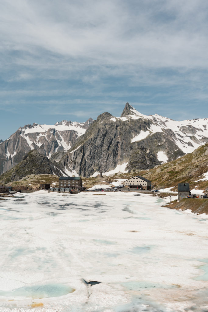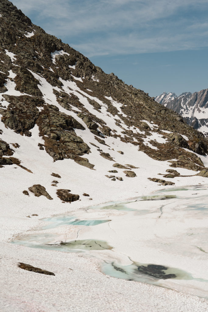 J’ai retrouvé mes collègues de ce voyage de presse à la Vallée d’Aoste aux alentours de 11h00 à la gare de Martigny. Notre chauffeur nous attendait et nous avons directement pris la route en direction de cette mystérieuse vallée dont je ne connaissais pas grand chose. Nous sommes passés par le col du Grand-Saint-Bernard, qui avait ouvert quelques jours auparavant. Le lac au sommet du col (2’469m d’altitude) était encore partiellement gelé et cela offrait de belles nuances de bleu.