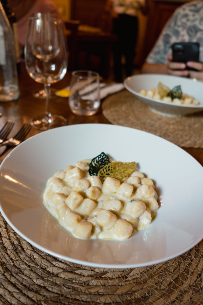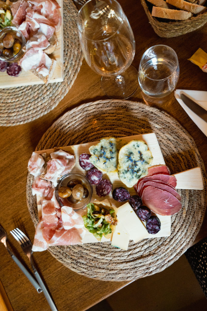 On a commencé notre dégustation de produits du terroir avec une splendide planche (tagliere alla valdostana) proposant tous les produits phares de la Vallée d’Aoste: jambon de Bosses, Fontina, lard blanc, miel et châtaignes. Pour la suite, nous avons goûté les gnocchis à la fondue de bleu d’Aoste puis le semifreddo « au pan ner ». Le tout accompagné d’un verre de pinot gris de la région.