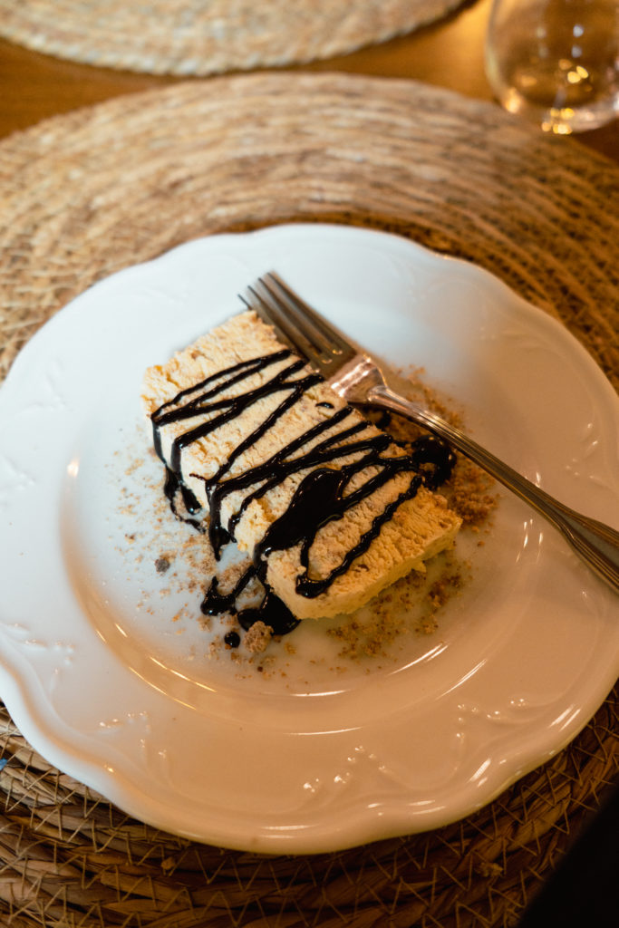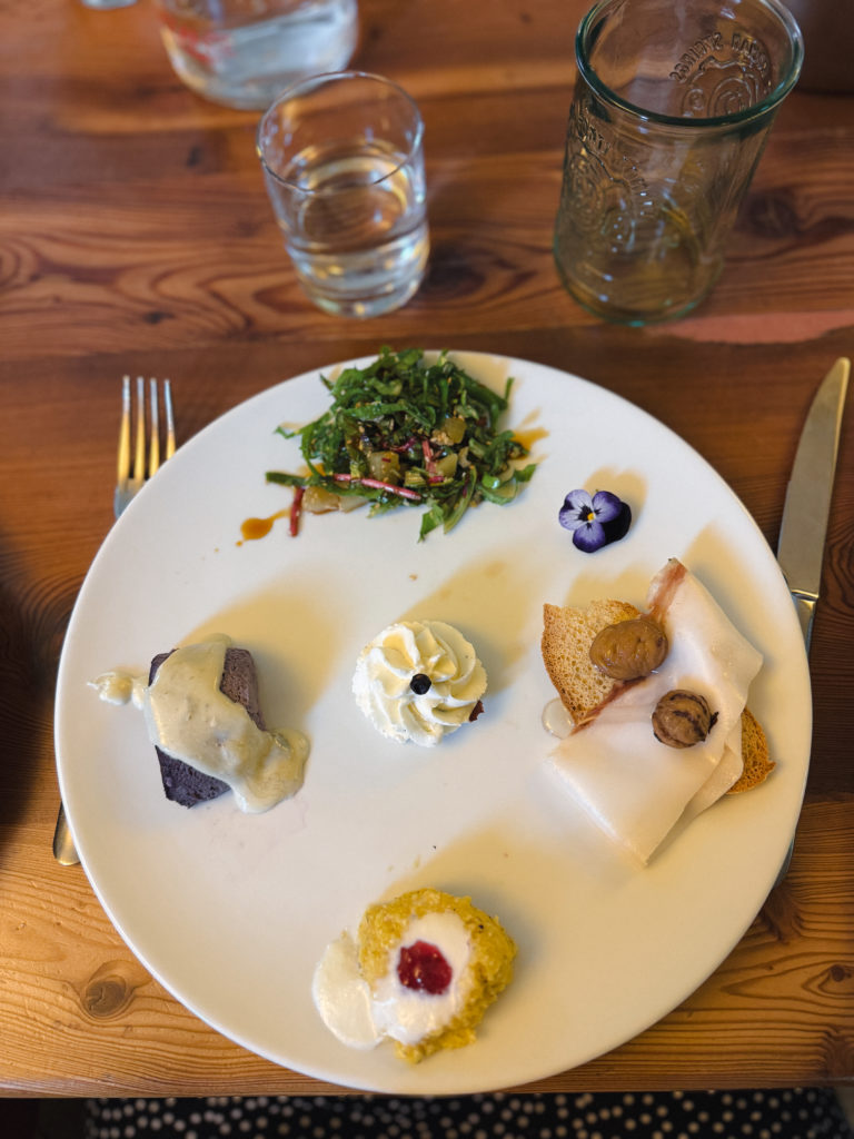 Pour le repas du soir, on a débuté avec un mélange d’antipastis locaux: salade de bettes et pommes de terre, lard de Bosses, châtaignes et miel, flan de chou violet avec fondue de Bleu d’Aoste et polenta. C’était parfait pour goûter à différents mets de la cuisine de la Vallée d’Aoste. Ensuite, j’ai choisi la crespelle alla valdostana, qui est une crêpe garnie avec beaucoup de fromage et de jambon. Un bon plat réconfortant de montagne!