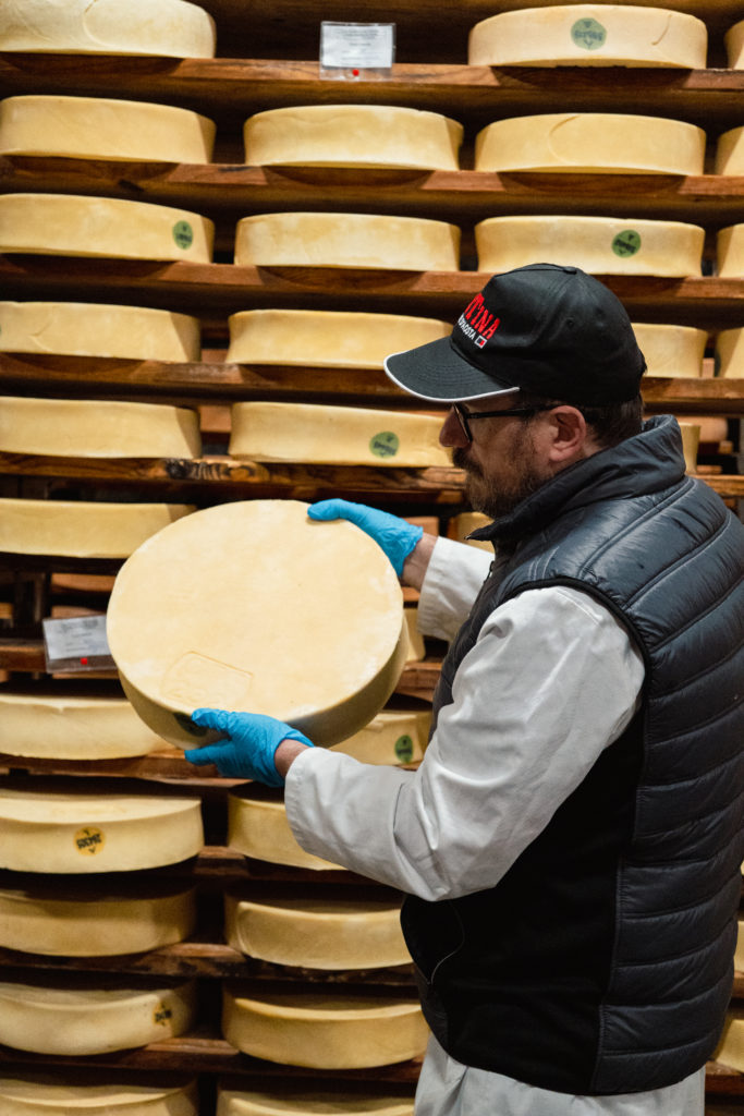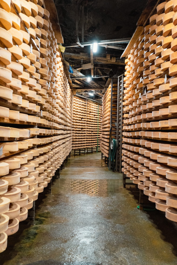 C’est le ventre plein que nous nous sommes rendus au musée de la Fontina à Valpelline. Si vous ne savez pas ce qu’est la Fontina, je vous rassure, je ne le savais pas non plus avant d’arriver à la Vallée d’Aoste. La Fontina AOP est un fromage typique du Val d’Aoste. Elle est produite à partir de lait de vache entier et sa pâte est mi-dure. La capacité de stockage de cette ancienne mine est de 60’000 meules, c’est très impressionnant à voir.