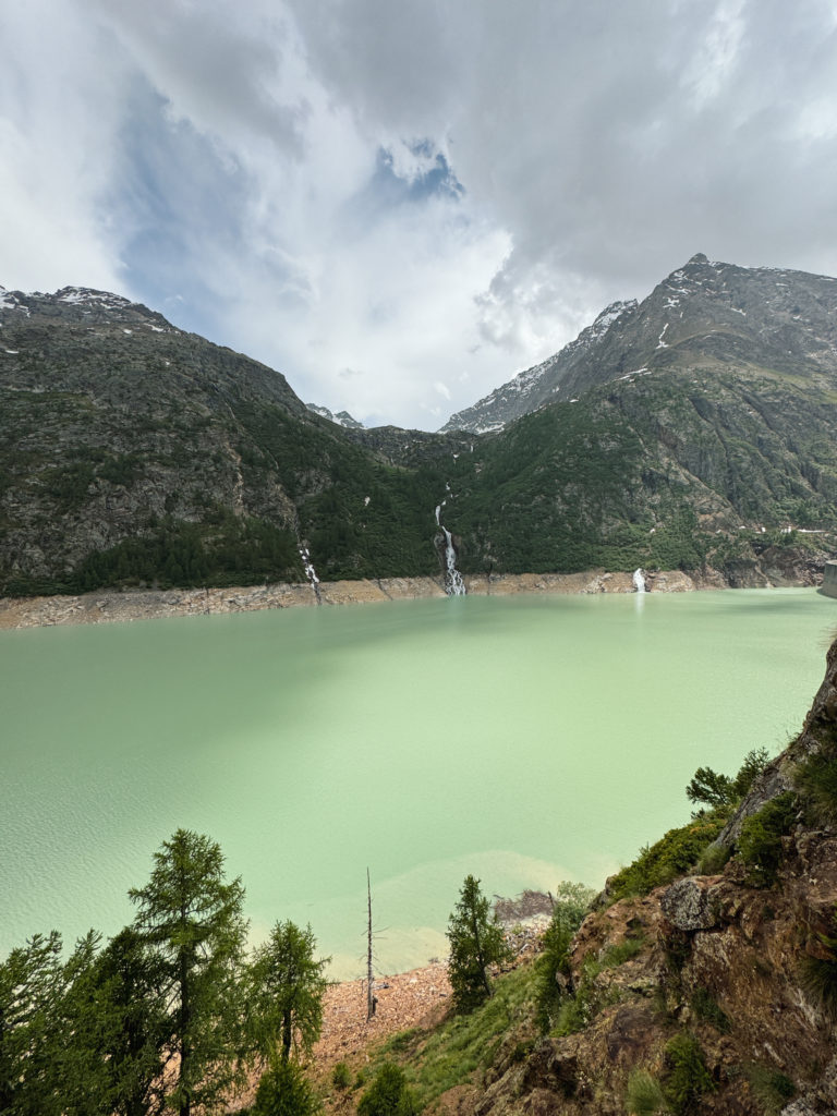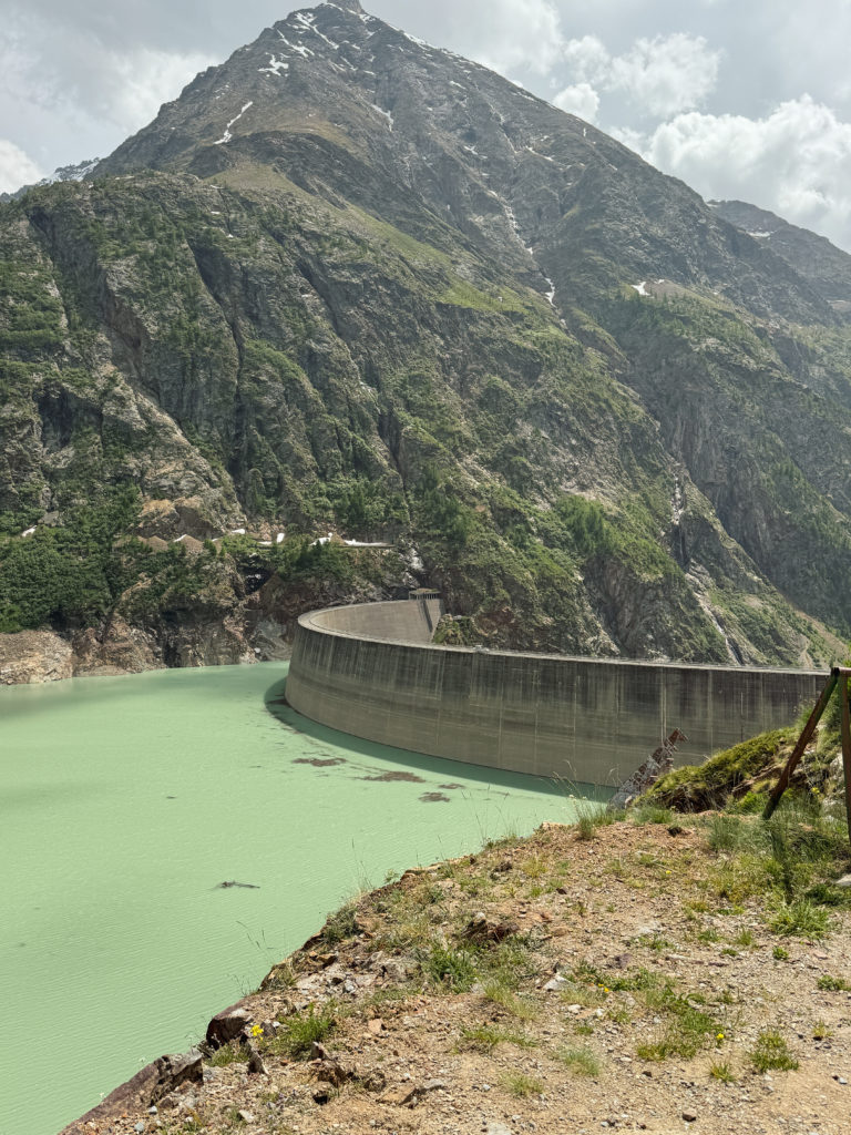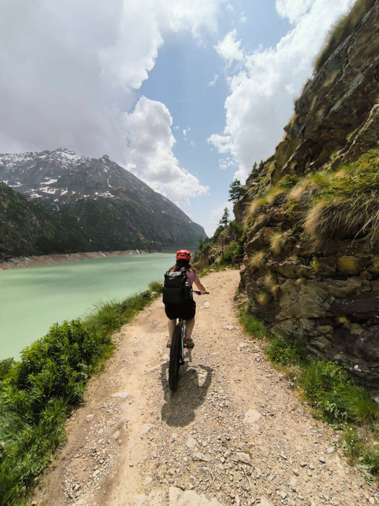 Je me suis réveillée avec quelques courbatures de mon aventures dans les arbres de la veille, mais cette journée s’annonçait sportive aussi! Depuis Bionaz, on est allés au barrage de Place Moulin à 15 minutes en voiture. On a troqué la voiture pour des vélos électriques, et avec notre guide, on a pédalé jusqu’au refuge de Prarayer à environ 5 kilomètres en longeant le lac. La balade est très sympa à faire, la couleur de l’eau du lac de Place Moulin est bleue turquoise et on croise une multitude de cascades, c’était parfait pour se rafraichir.