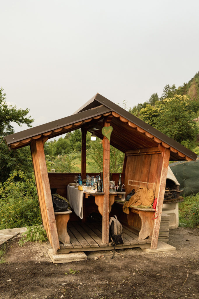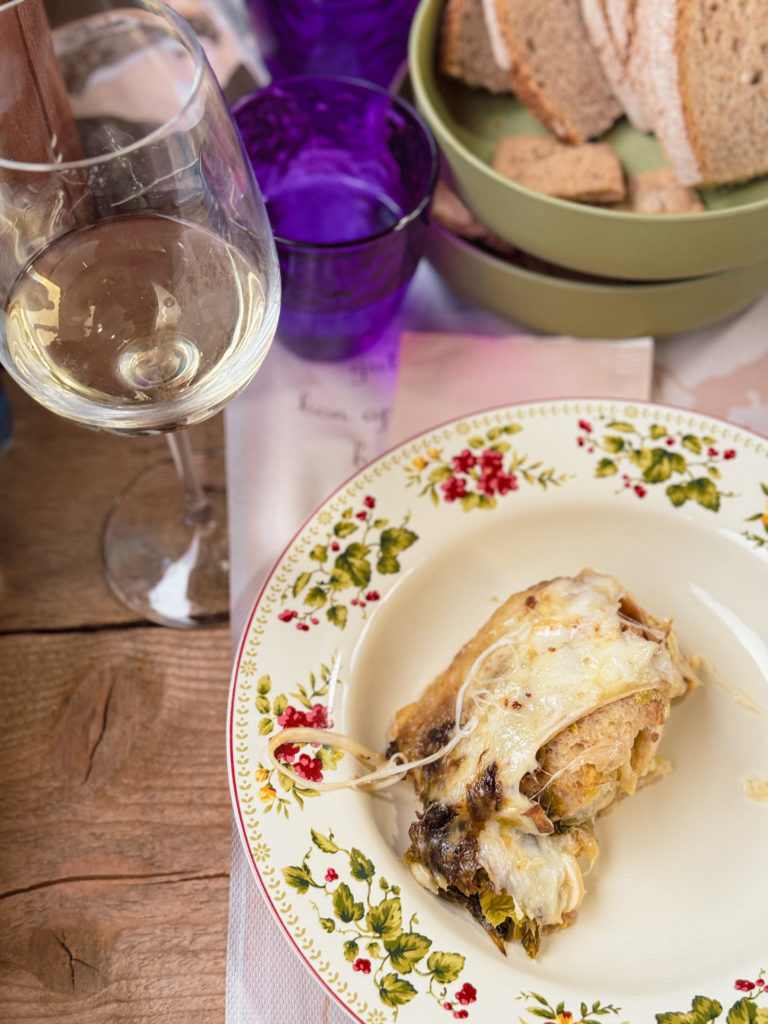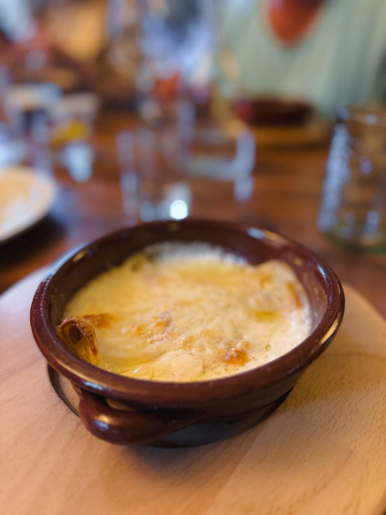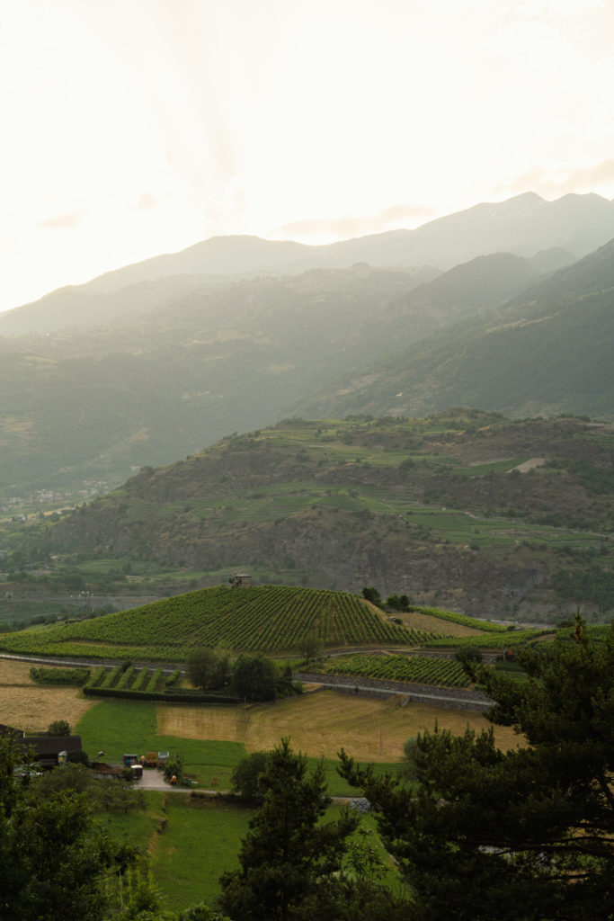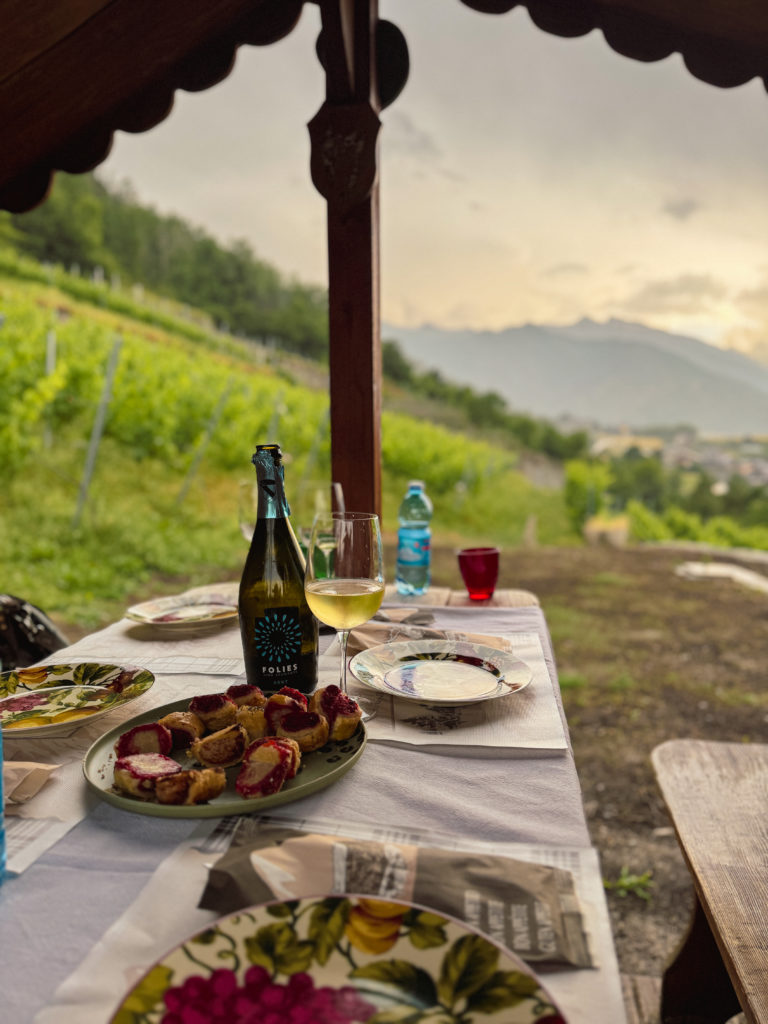 Une fois la soupe enfournée, on a commencé notre festin valdôtain dans une jolie petite cabane au milieu des vignes avec une vue à couper le souffle sur la vallée et un magnifique coucher de soleil. Après un apéritif riche, on a gouté à cette fameuse soupe à la Vapelenentse et c’était délicieux! J’avais peur que cela soit lourd avec la quantité de fromage et la chaleur, mais c’était très bien équilibré. Je trouve que ça ressemblait à une croûte au fromage plus qu’à une soupe. On a passé un moment authentique et inoubliable.