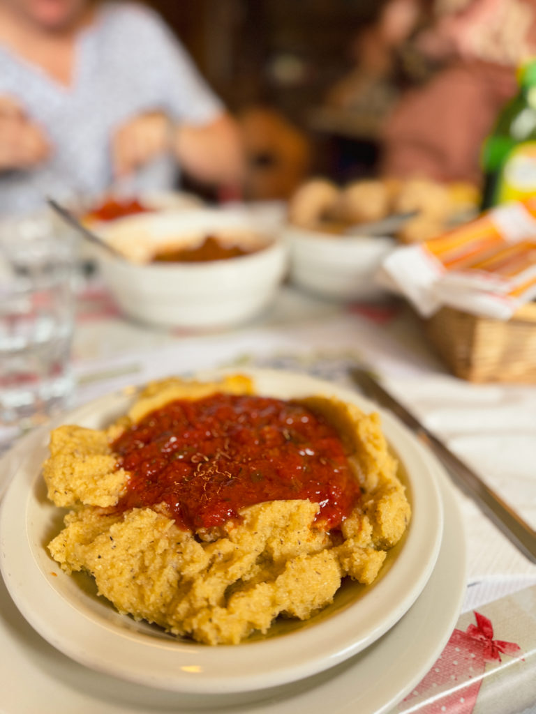 Ces quelques kilomètres de vélo sous une chaleur écrasante nous ayant donné faim, on s’est mis à table. Le refuge de Prarayer est hyper convivial et offre de bons plats locaux, dans un cadre splendide. On ne change pas les bonnes habitudes, on a commencé par une mise en bouche avec de la charcuterie valdôtaine et de la Fontina bien sûr! Pour le plat de résistance, j’ai choisi la polenta boscaiola, qui est recouverte d’une sauce tomate aux champignons.