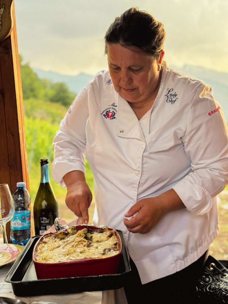 Après un passage rafraîchissant dans le jacuzzi, nous avons rencontré Alessia, une « Cesarine » qui invite chez elle les personnes qui souhaitent découvrir la gastronomie locale. Alessia travaille dans un supermarché à Aoste, organise des cours de cuisine et s’occupe de la vigne également, c’était une très belle rencontre.