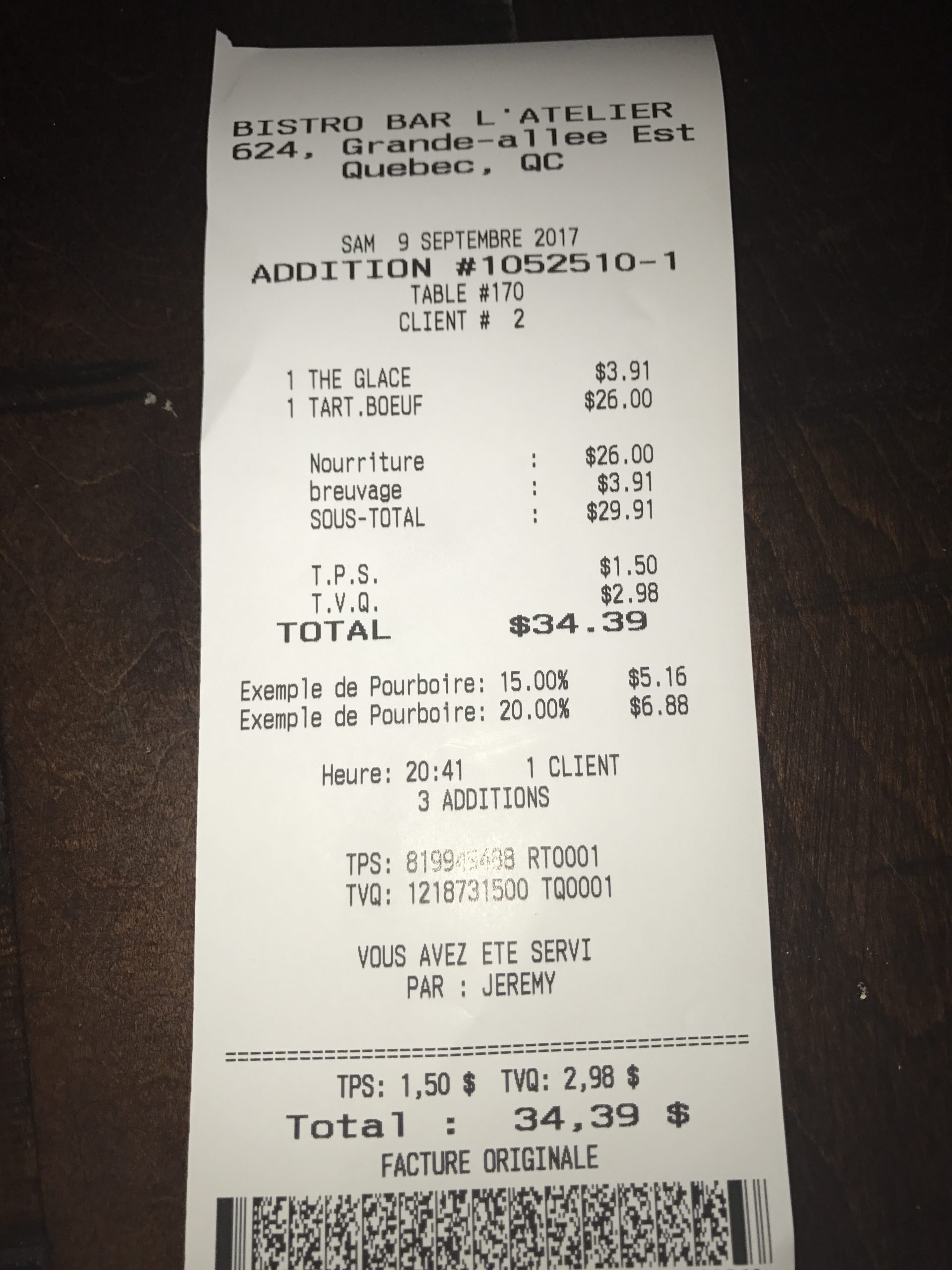 Le soir, nous sommes allés manger dans un restaurant tendance et moderne, L’Atelier, situé à 624, Grande Allée Est où j’ai dégusté un excellent tartare de boeuf « Old school » à CAD 26$.