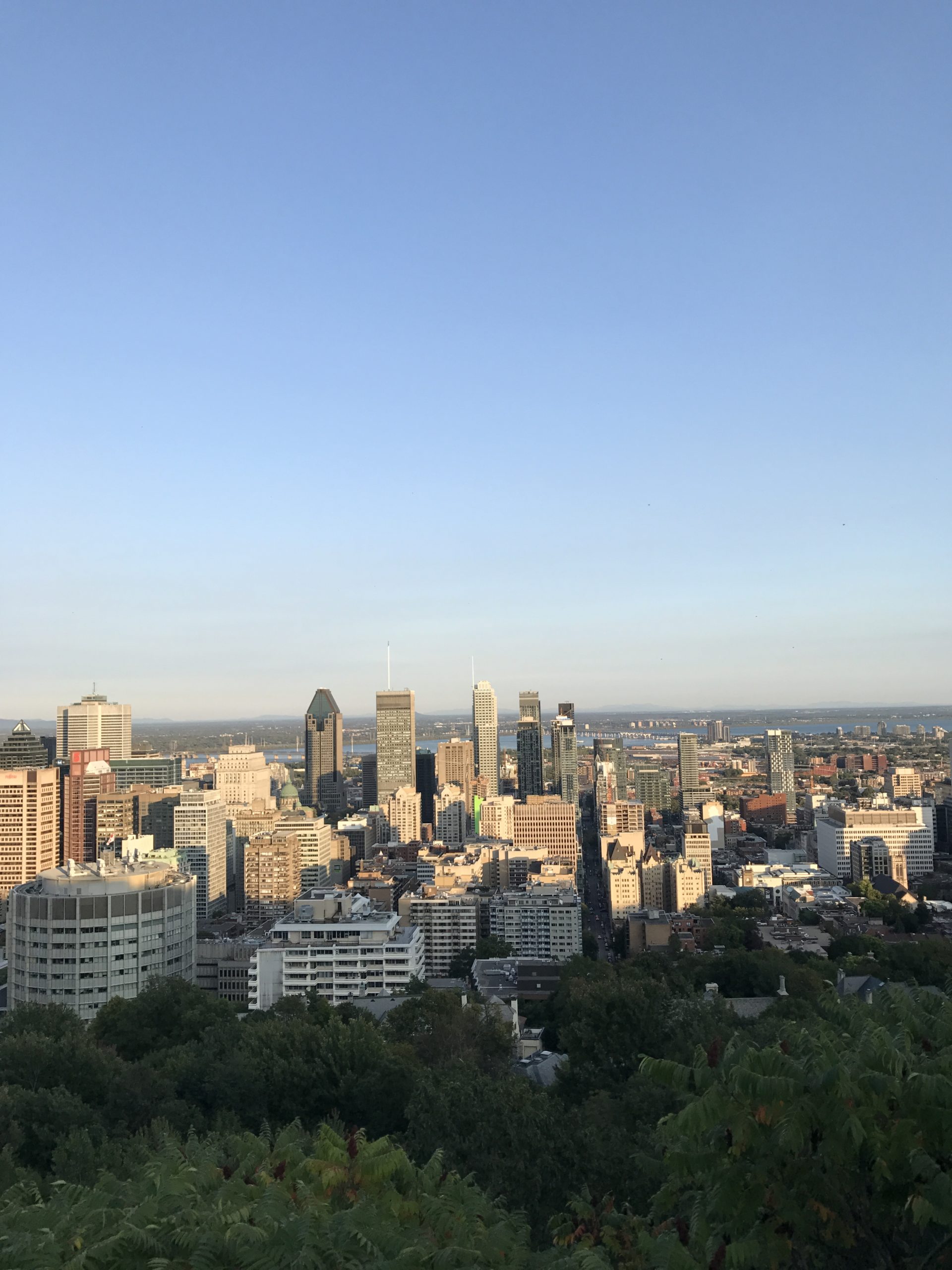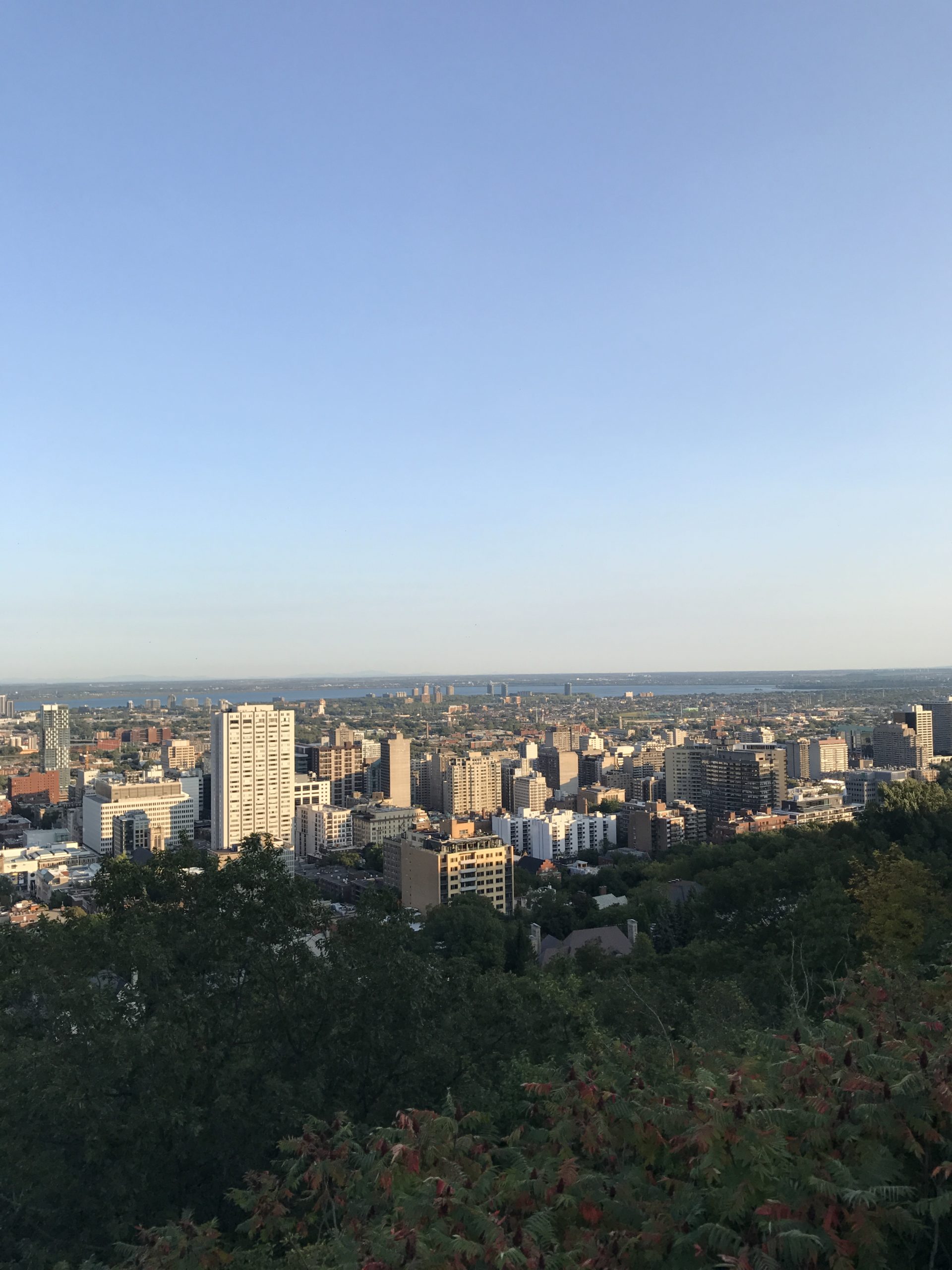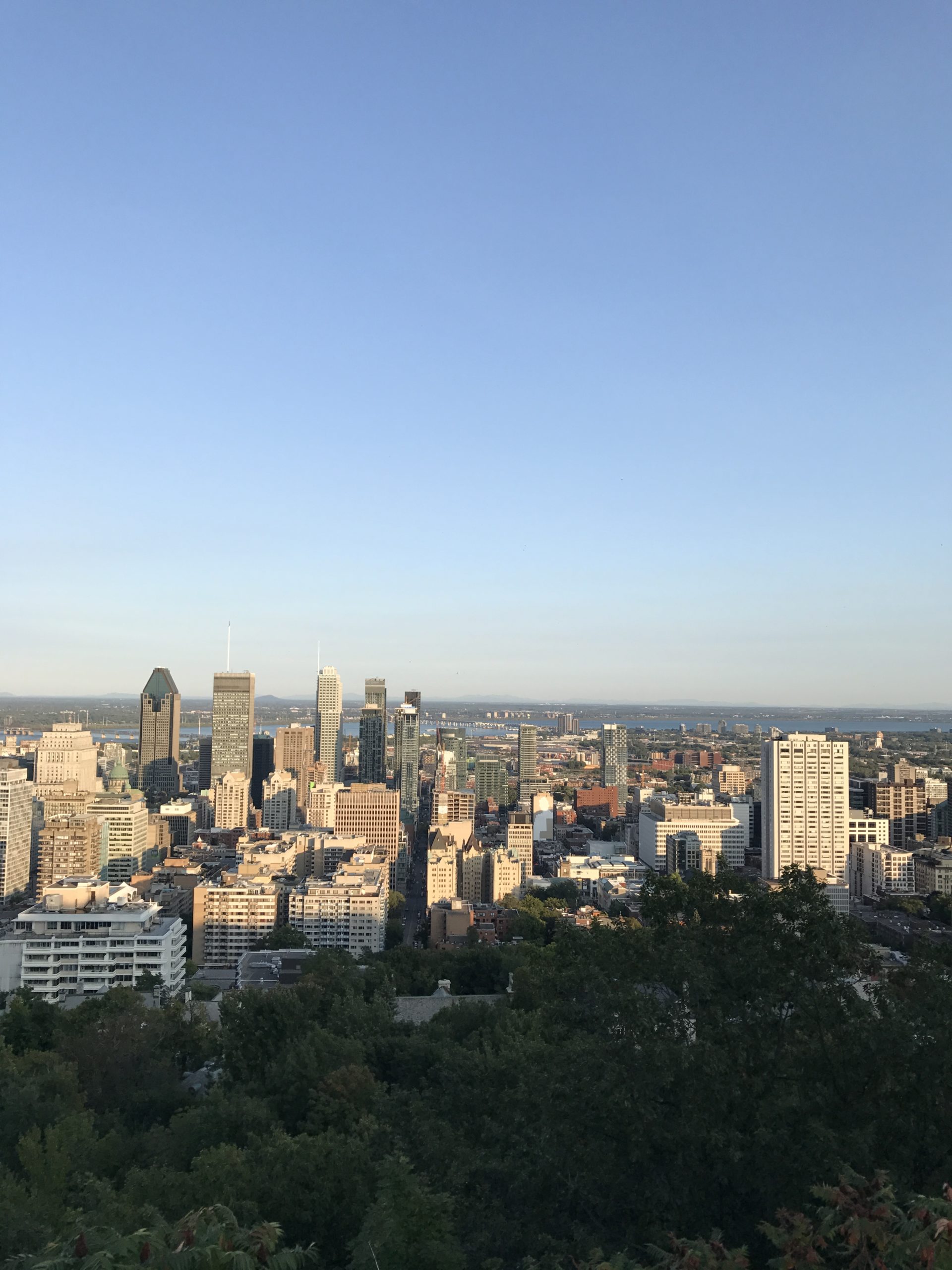Vu que nous avions la fin d’après-midi et la soirée libre, nous avons décidé de retenter notre chance pour nous rendre à l’Observatoire du Mont-Royal, nous avons donc appelé un Uber pour nous y emmener. Ce dernier n’a tout de même pas pu nous y conduire, mais nous a laissé à l’entrée du cimetière du Mont-Royal d’où nous avons dû marcher une vingtaine de minutes jusqu’à l’Observatoire. Pour vous faire une idée, pour une course Uber de 20 minutes et de 6 kilomètres, nous avons payé CAD 18,64$. Je ne regrette absolument pas de m’être rendue à l’Observatoire, c’est un lieu magnifique avec une vue incroyable sur toute la ville de Montréal. De plus, nous y sommes allés à l’heure du coucher du soleil ce qui a amené des couleurs magnifiques.